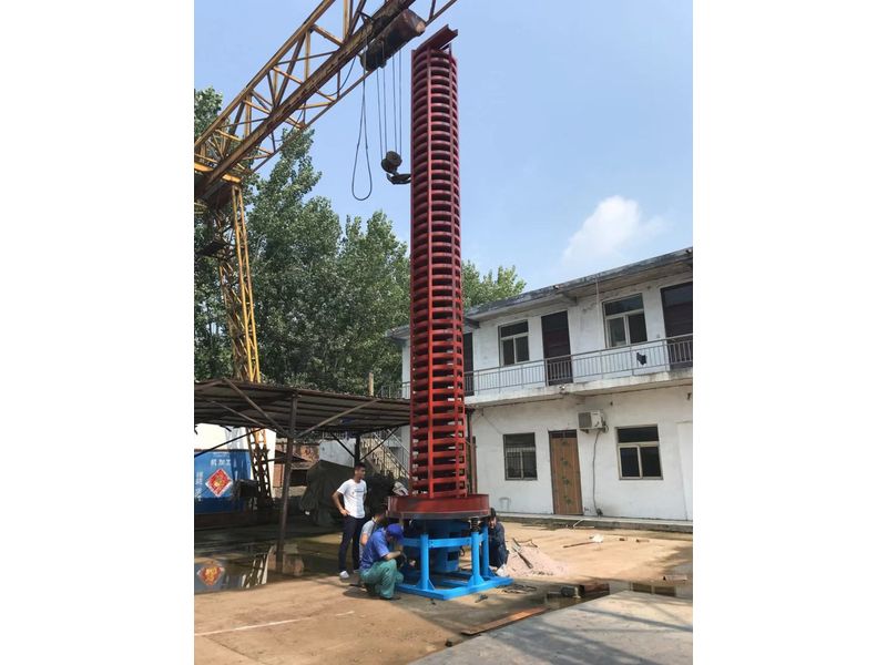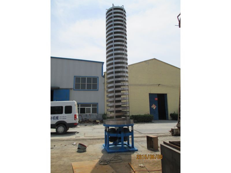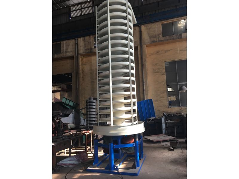 ZC系列垂直提升機的驅動裝置振動電機安裝在輸送塔下部,兩臺振動電機對稱交叉安裝,輸送塔由管體和焊接在管體周圍的螺旋輸送槽組成,輸送塔座于減振裝置 上,減振裝置由底座和隔振彈簧組成。當垂直提升機工作時,根據雙振動電機自同步原理,由振動電機產生激振力,強迫整個輸送塔體作水平圓運動和向上垂直運動 的空間復合振動,螺旋槽內的物料則受輸送槽的作用,作勻速拋擲圓運動,沿輸送槽體向上運動,從而完成物料的向上(或向下)輸送作業,因此本設備也被成為振 動垂直輸送機。